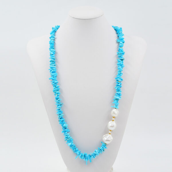 Collana in turchese, perla, chiusura in argento dorato