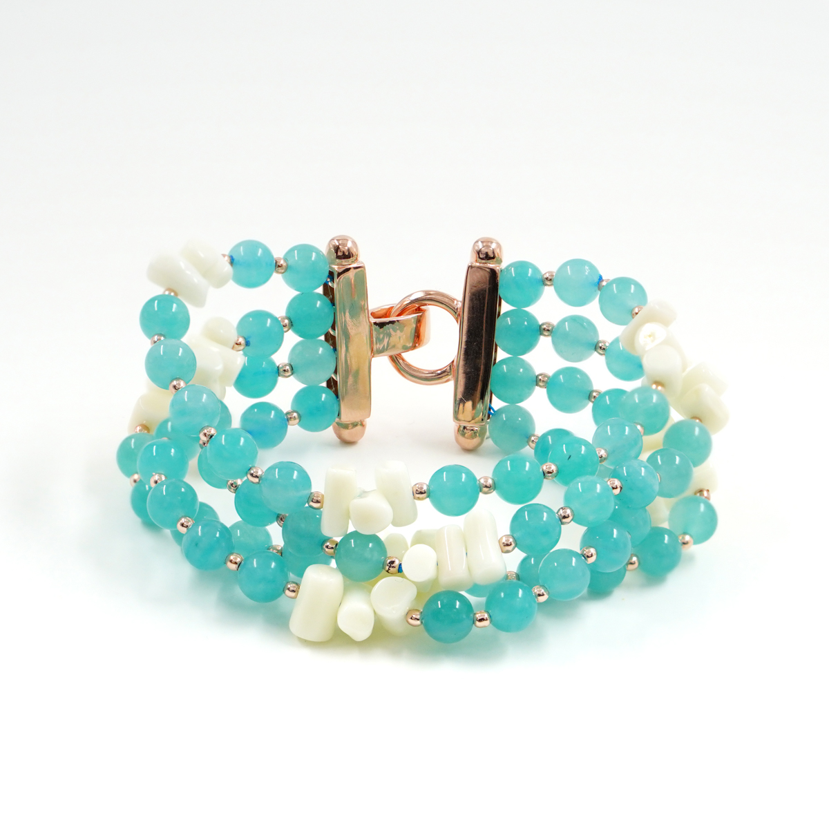 Bracciale Multifilo in amazzonite, corallo bianco, chiusura argento rosè