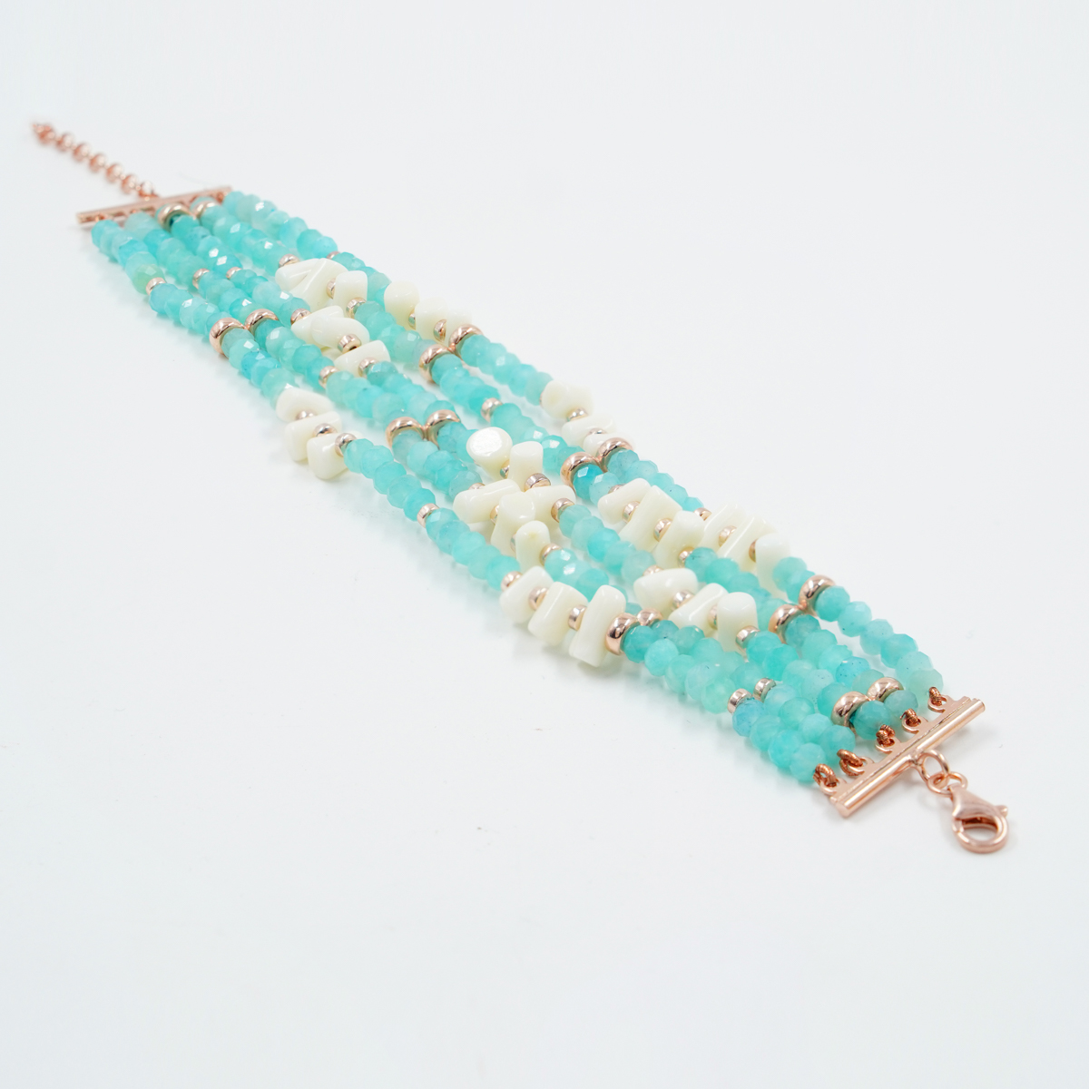 Bracciale Multifilo in amazzonite, corallo bianco, chiusura in argento rosè