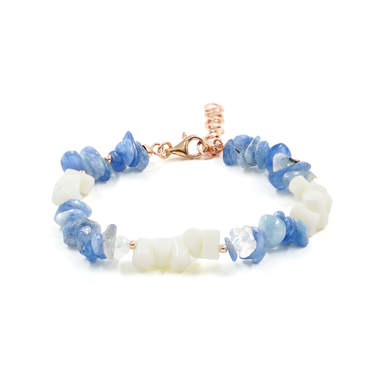 Bracciale in chips di cianite, corallo bianco, chiusura in argento rosè