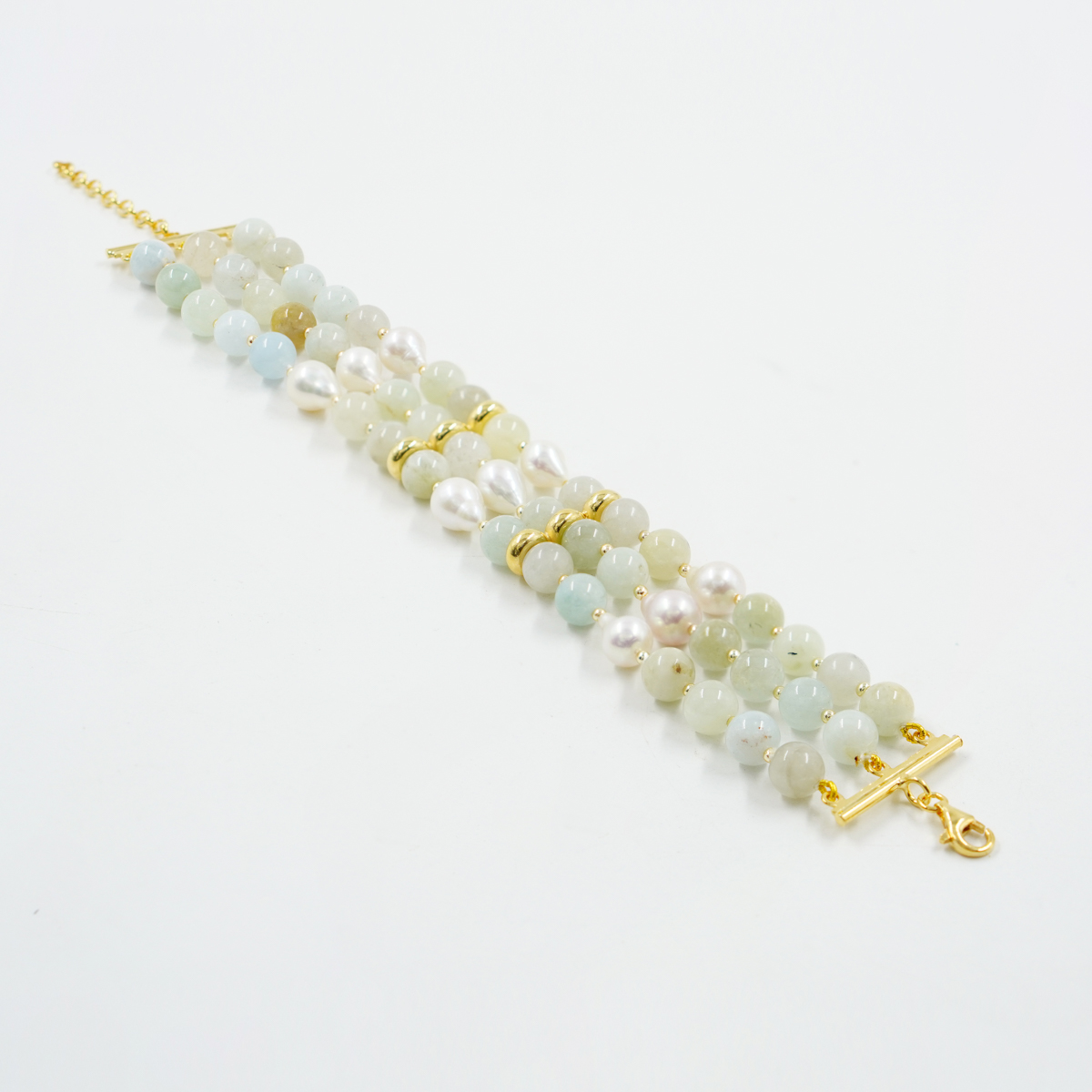 Bracciale in acquamarina, perle, chiusura argento dorato