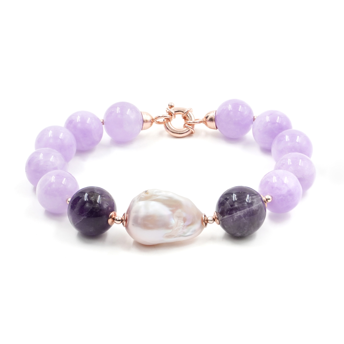 Bracciale in ametista viola e lavanda, perla, chiusura in argento rosè