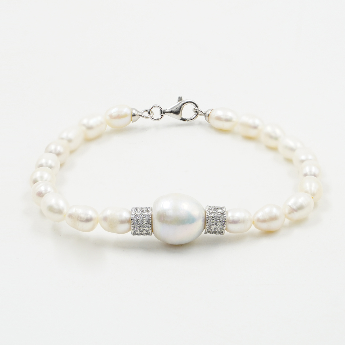 Bracciale in perle, elemento in ottone con zirconi, chiusura argento rodiato