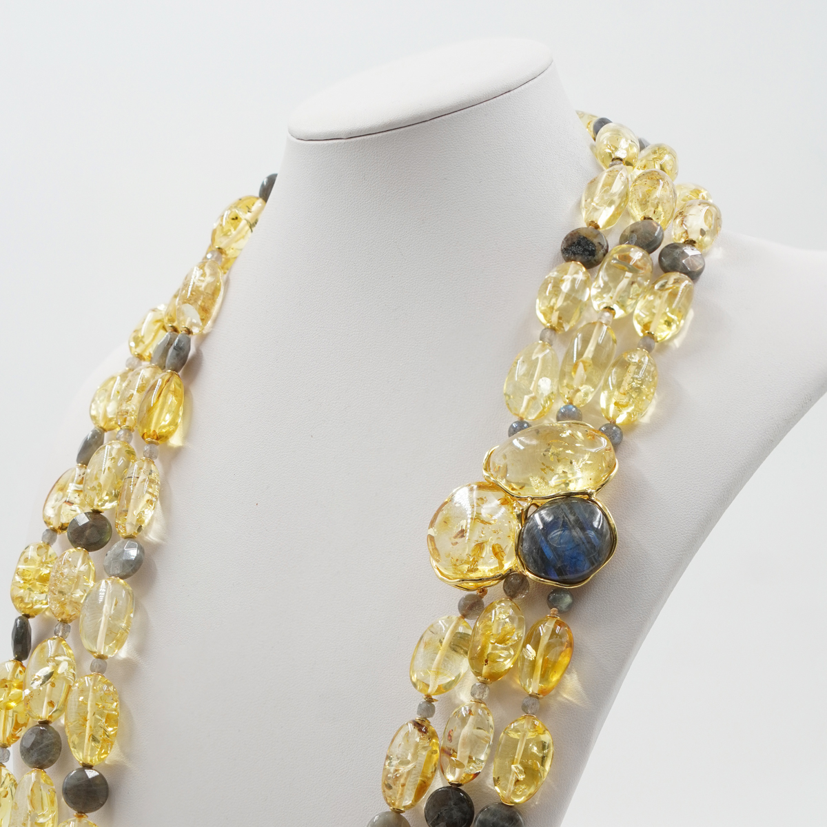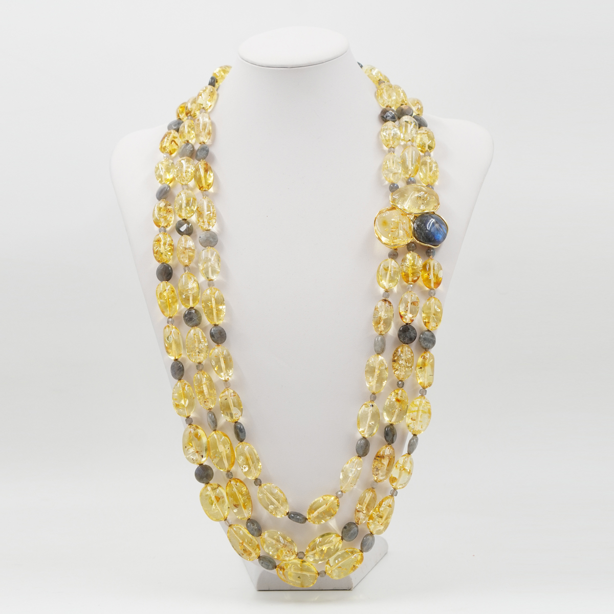 Collana in ambra citrino, labradorite, centrale e chiusura in argento dorato
