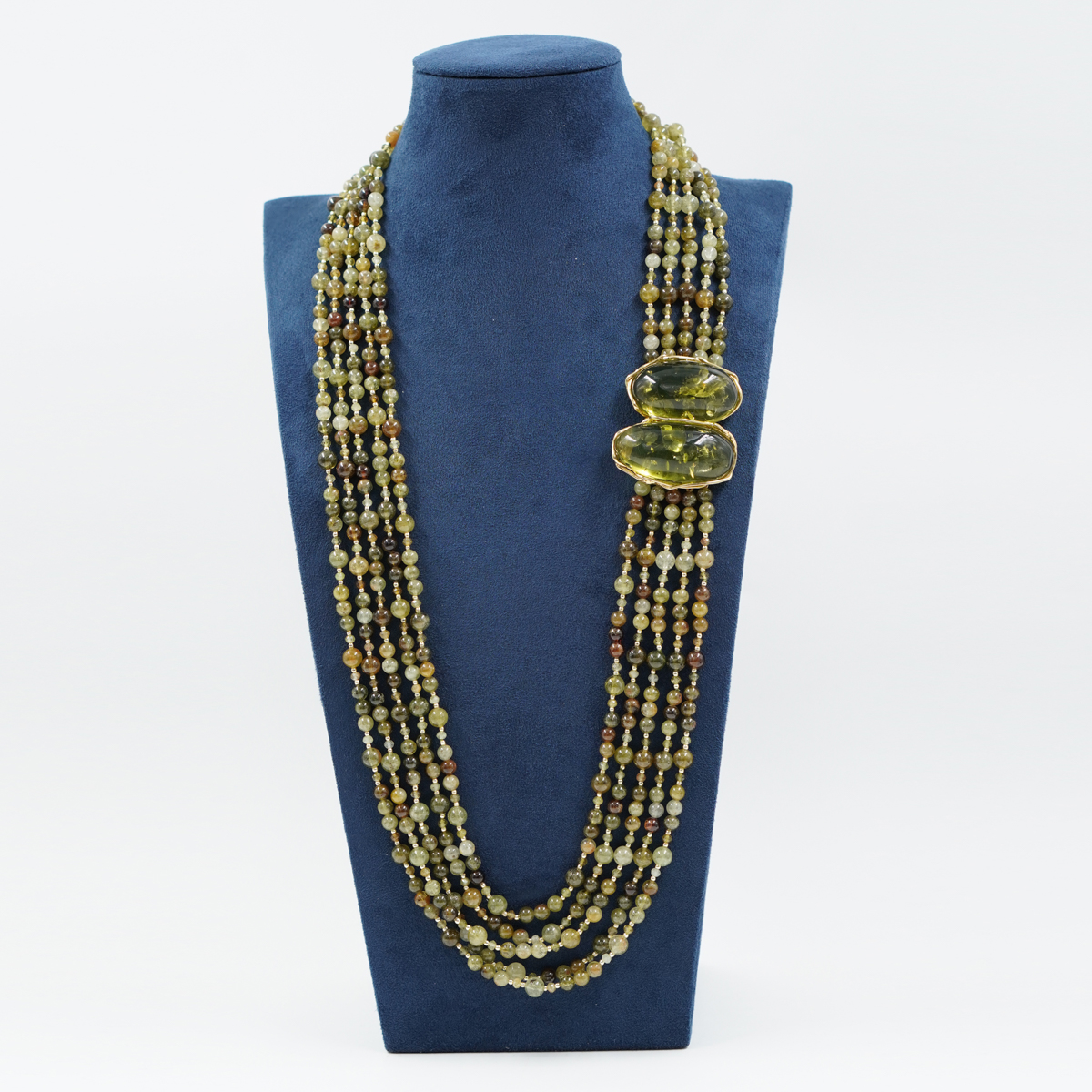 Collana in granato verde, ambra verde, centrale e chiusura argento dorato