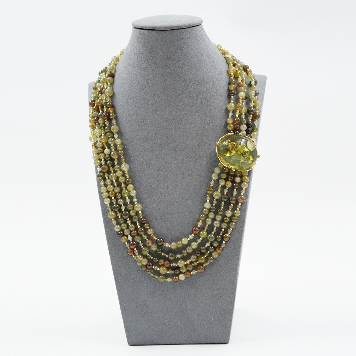 Collana in granato verde, ambra verde, centrale e chiusura argento dorato