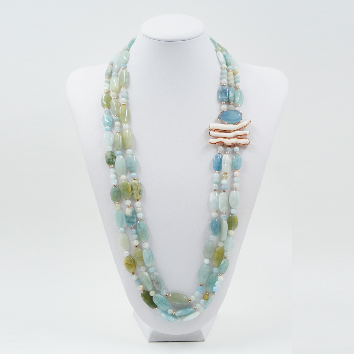 Collana in acquamarina, corallo bianco, chiusura in argento rosè