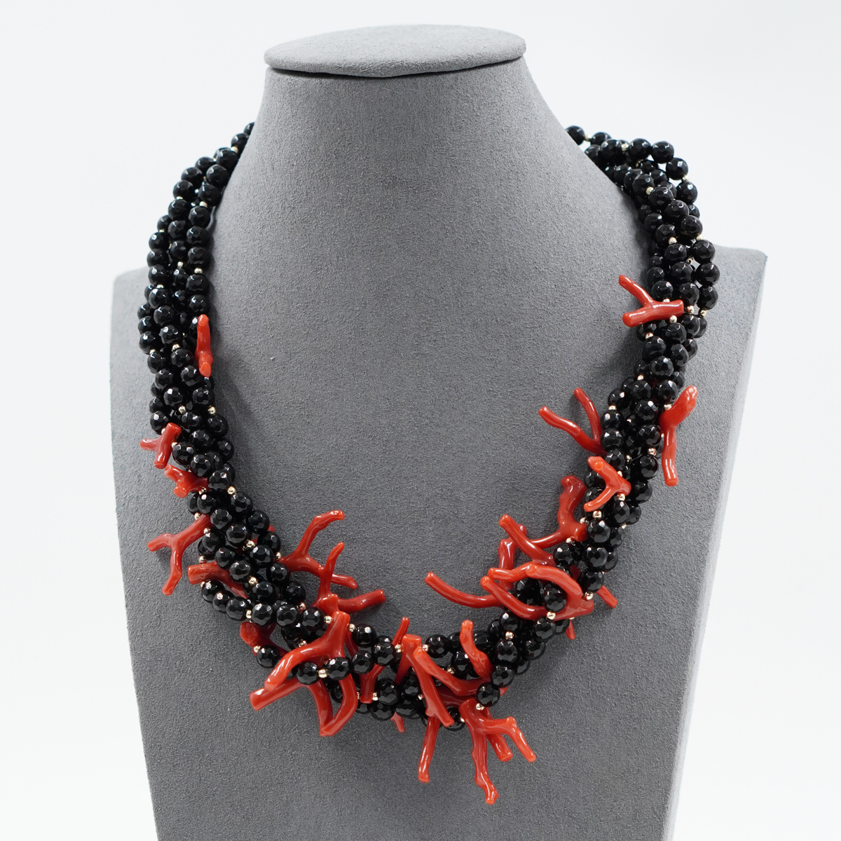 Collana Multifilo in agata nera, rami di corallo, chiusura in argento dorato