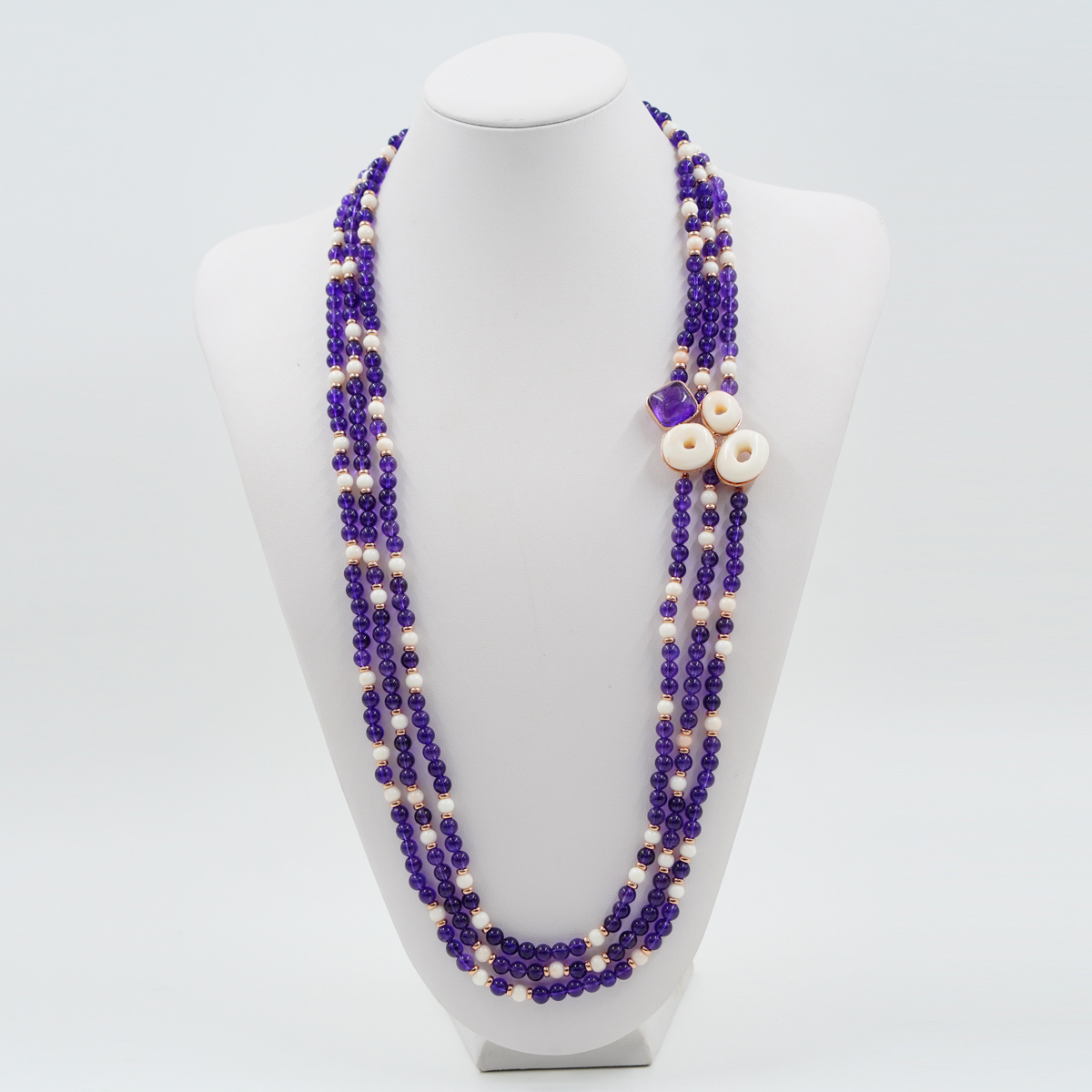 Collana in ametista, corallo rosa, centrale e chiusura argento rosè