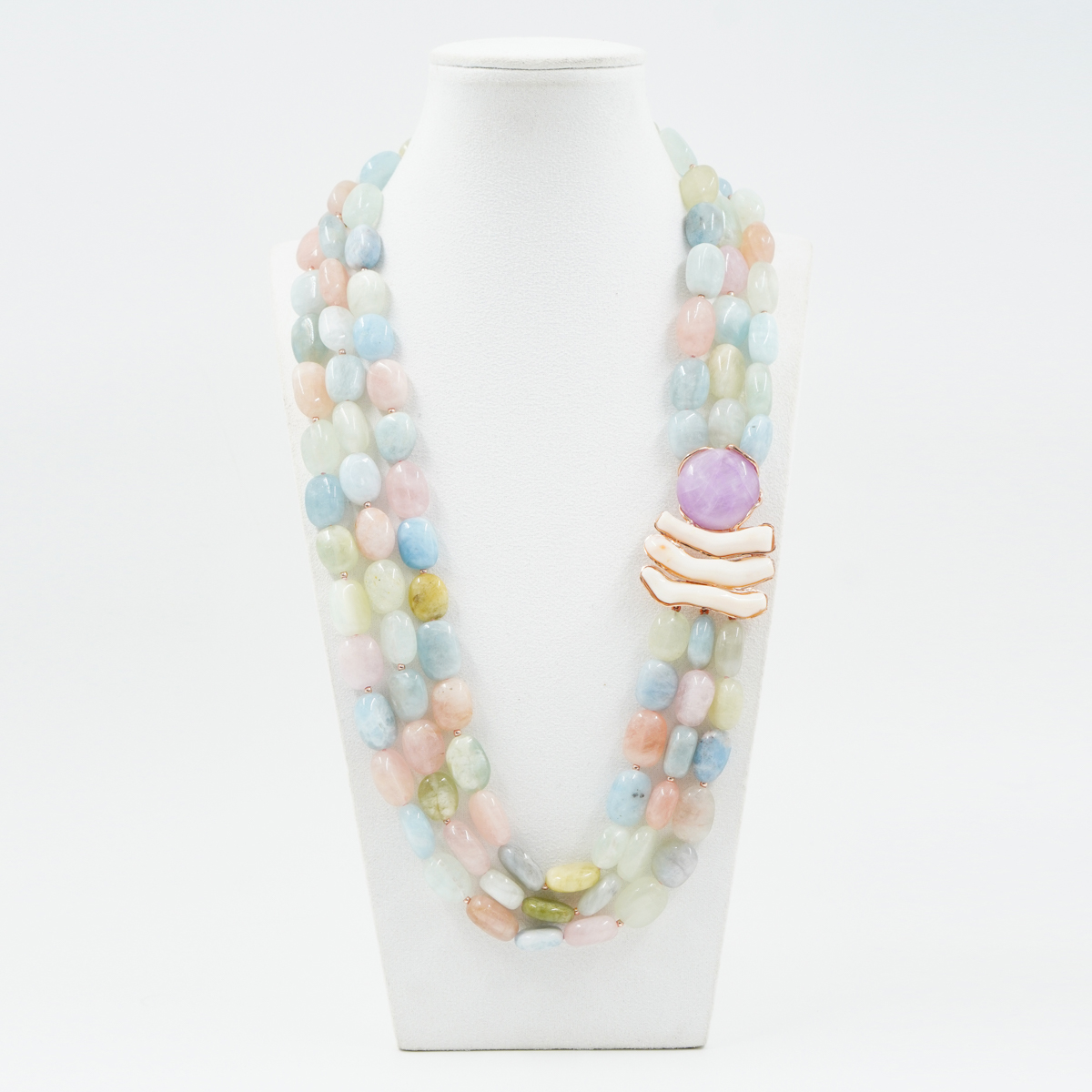 Collana in sassi berillo, corallo bianco, kunzite, centrale e chiusura argento rosè