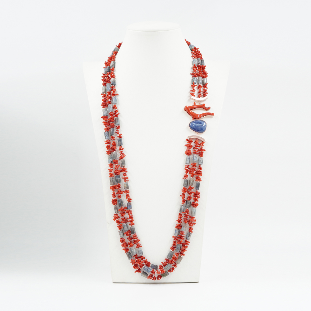 Collana in cianite, corallo, centrale con cianite e ramo corallo, chiusura in argento rosè