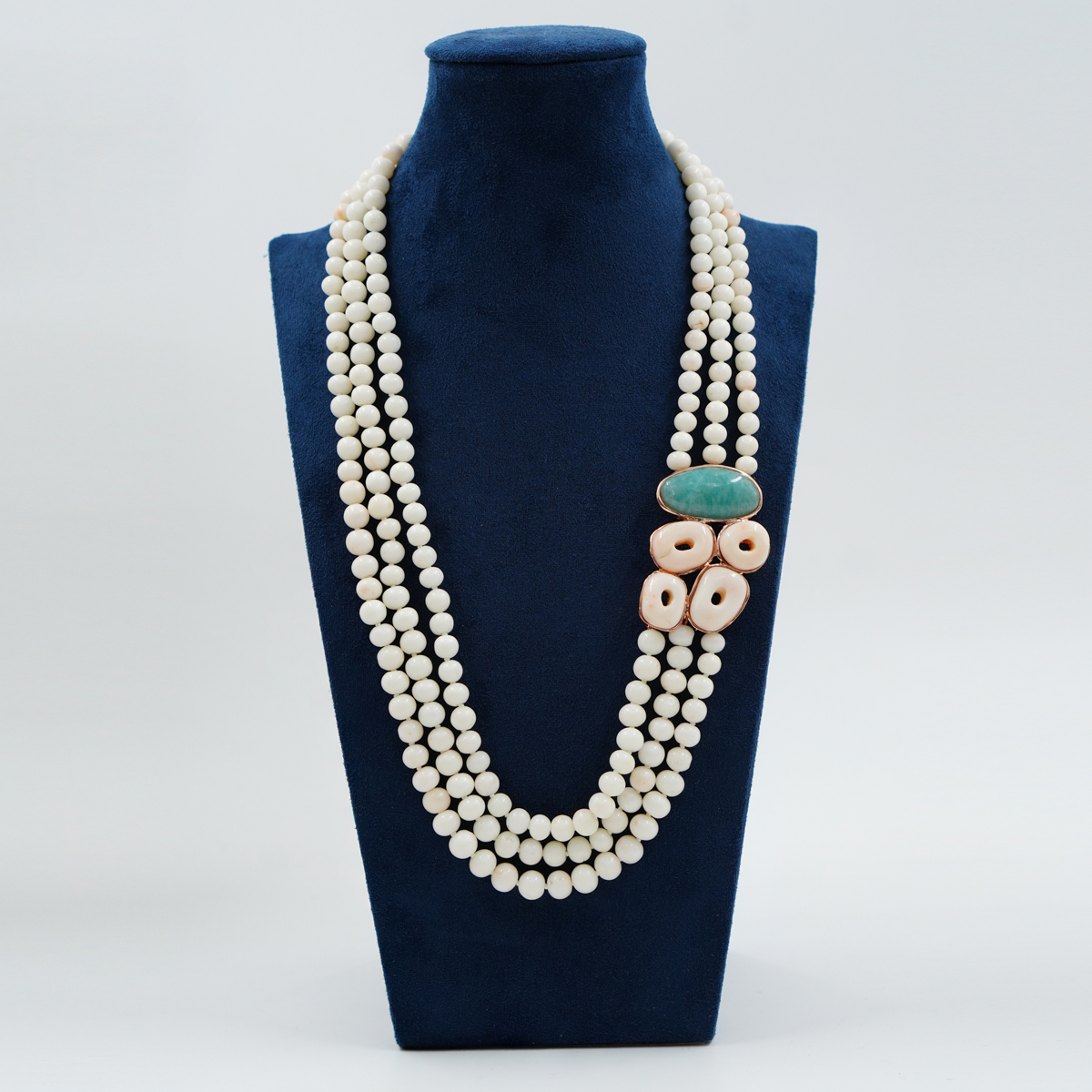 Collana in corallo bianco, amazzonite, centrale e chiusura argento rosè