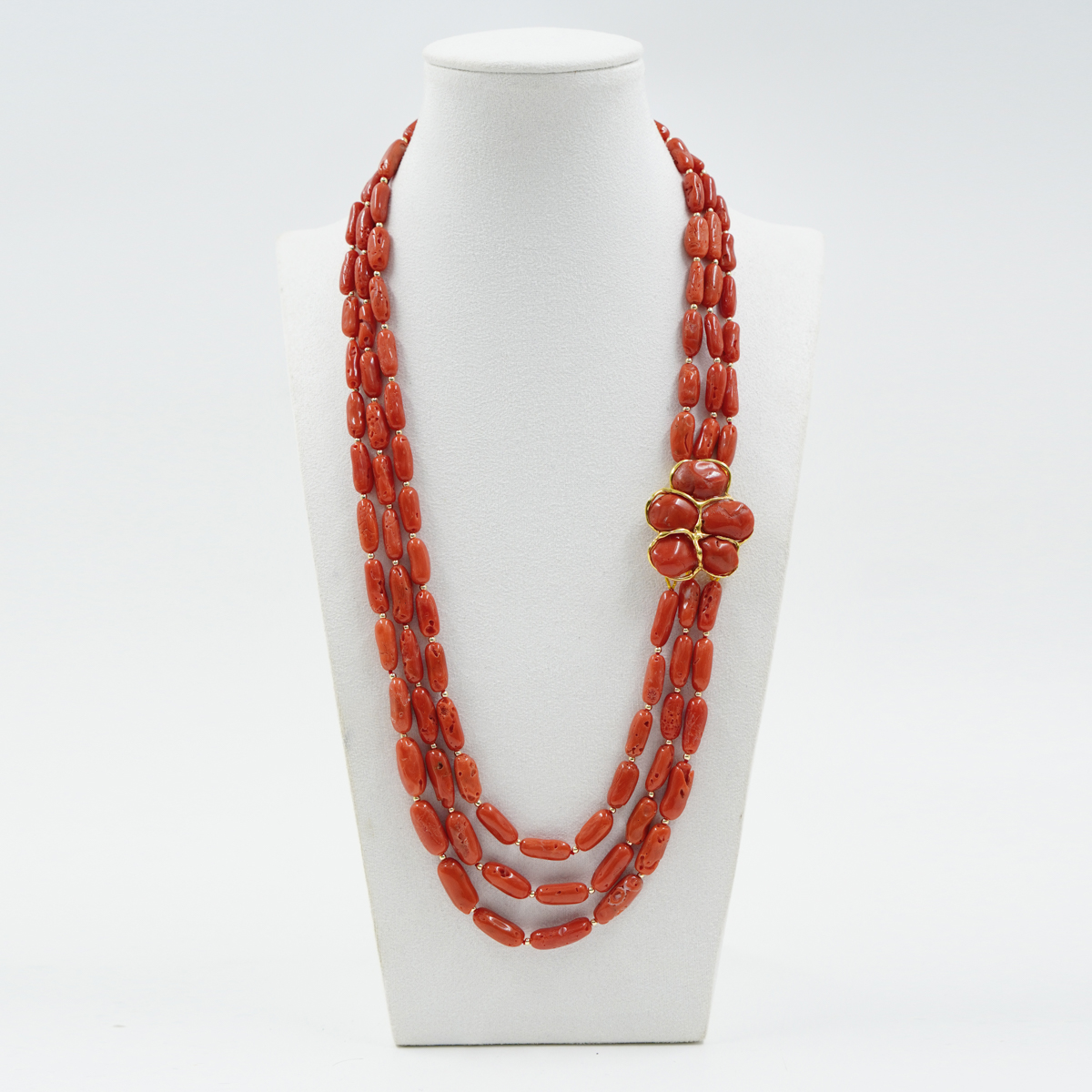 Collana in cilindri di corallo, centrale e chiusura in argento dorato