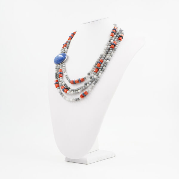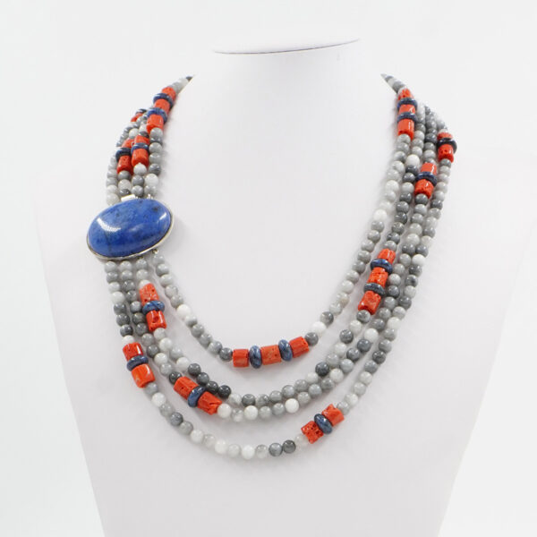 Collana con occhio d’aquila, corallo, dumortierite montato su chiusura in argento rodiato