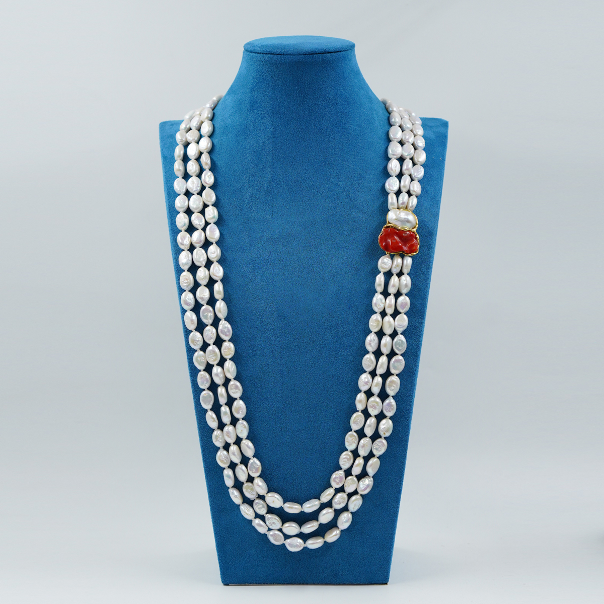 Collana in perle, corallo e perla barocca in centrale e chiusura argento dorato