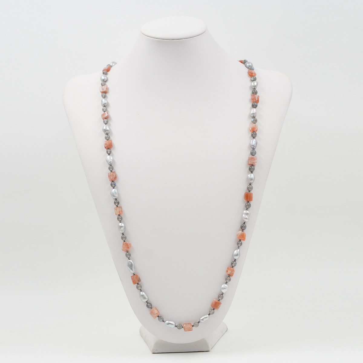 Collana in perla grigia, pietra del Sole, labradorite, chiusura in argento rodiato