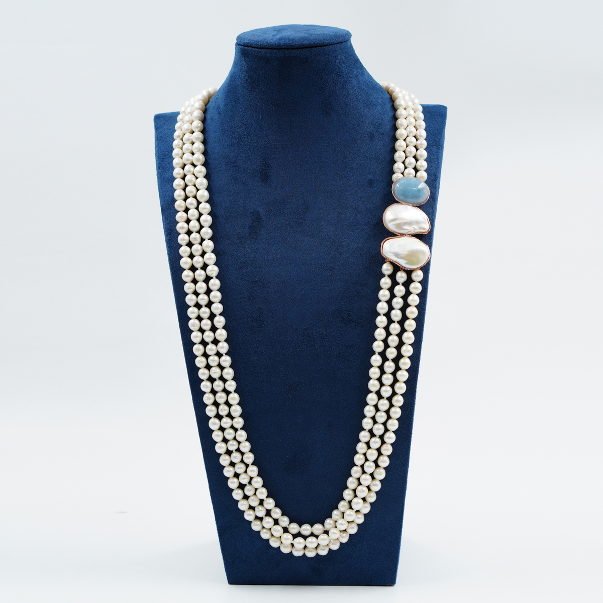 Collana in perle, acquamarina, centrale e chiusura argento rosè