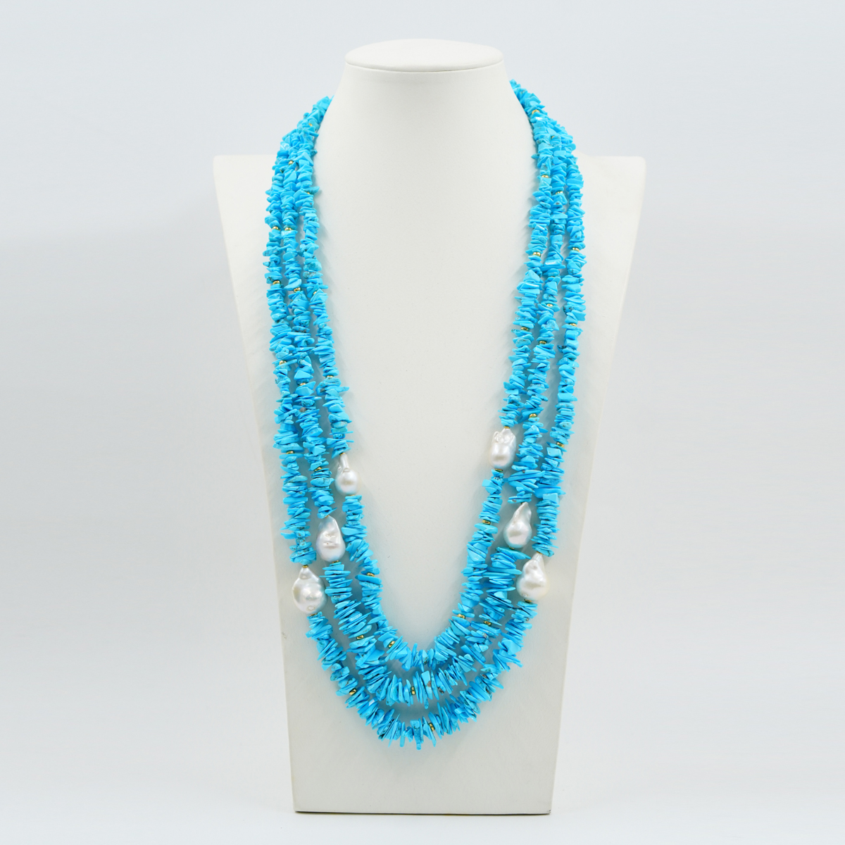 Collana Multifilo con chips di turchese naturale, perle barocche, elementi in argento – Dorato