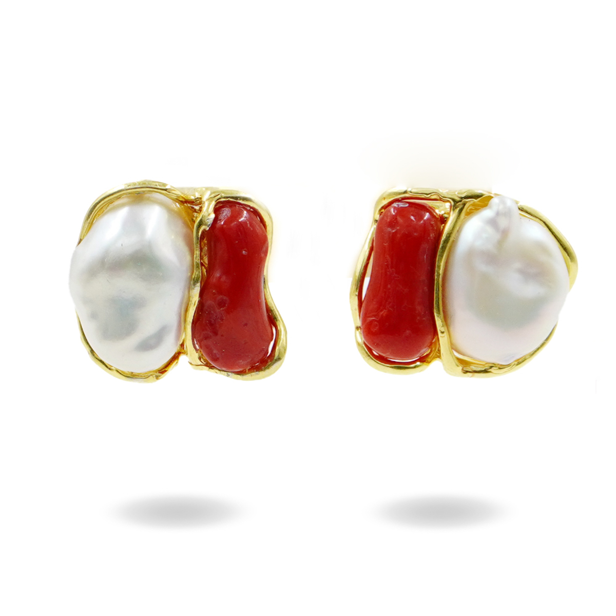 Orecchini Argento con Corallo, Perla Barocca Piatta – Dorato