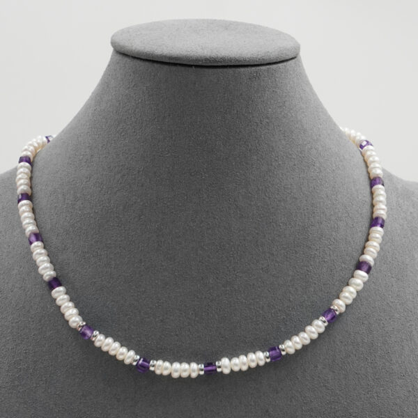 Collana in perla, pietra del Sole, labradorite, chiusura in argento rodiato