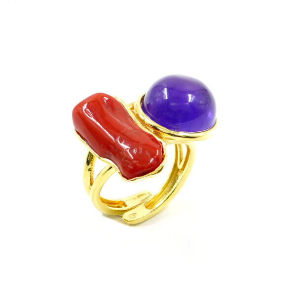Anello Argento con Corallo, Ametista – Dorato